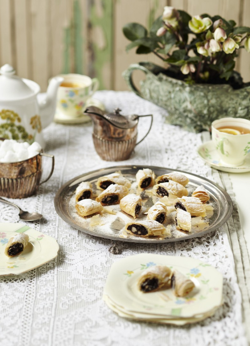Brush the rolled logs with butter and bake for 15 minutes until golden and crisp. Cool. Using a very sharp knife, cut each roll on an angle into 6 pieces. Transfer to a serving platter and dust with icing sugar. Makes 24 pieces