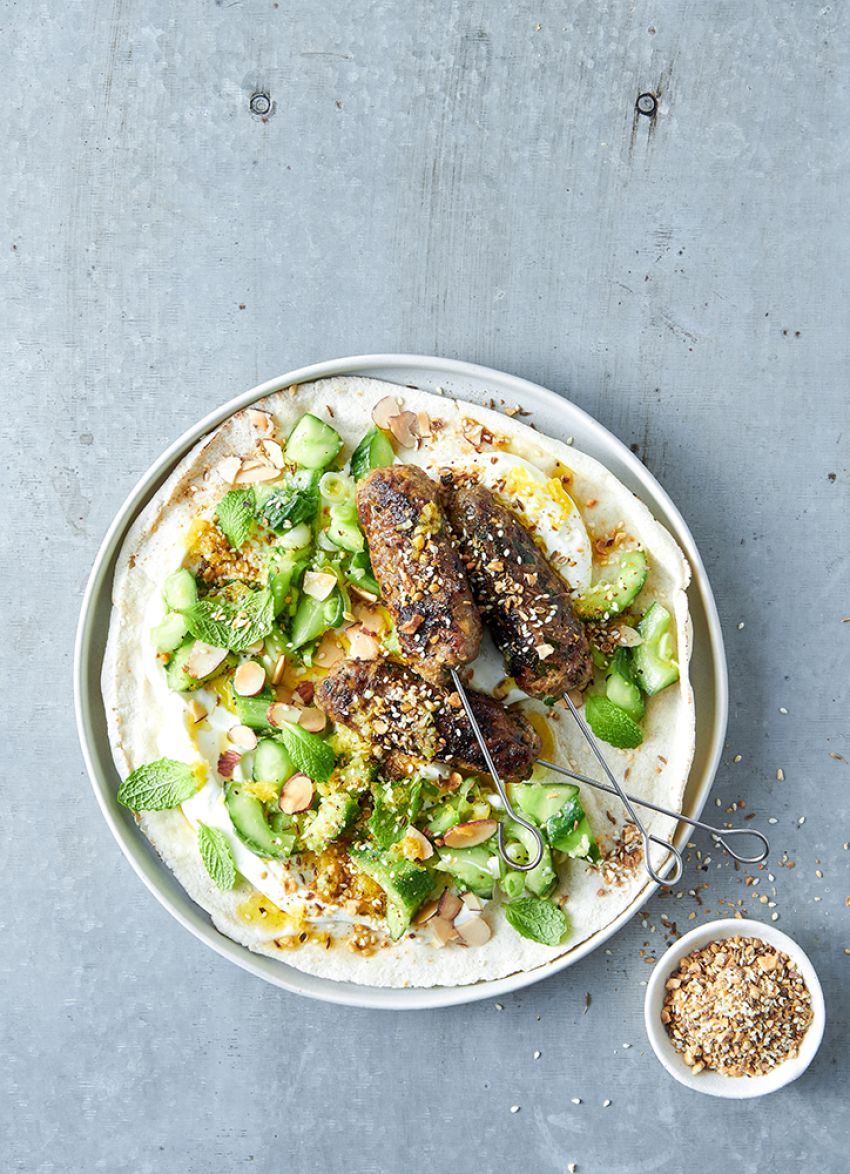 To serve: Swirl the yoghurt on the warm flatbreads and spoon over the smashed cucumber. Top each plate with 3 kofta then scatter over the mint, almonds and dukkah. Serves 2