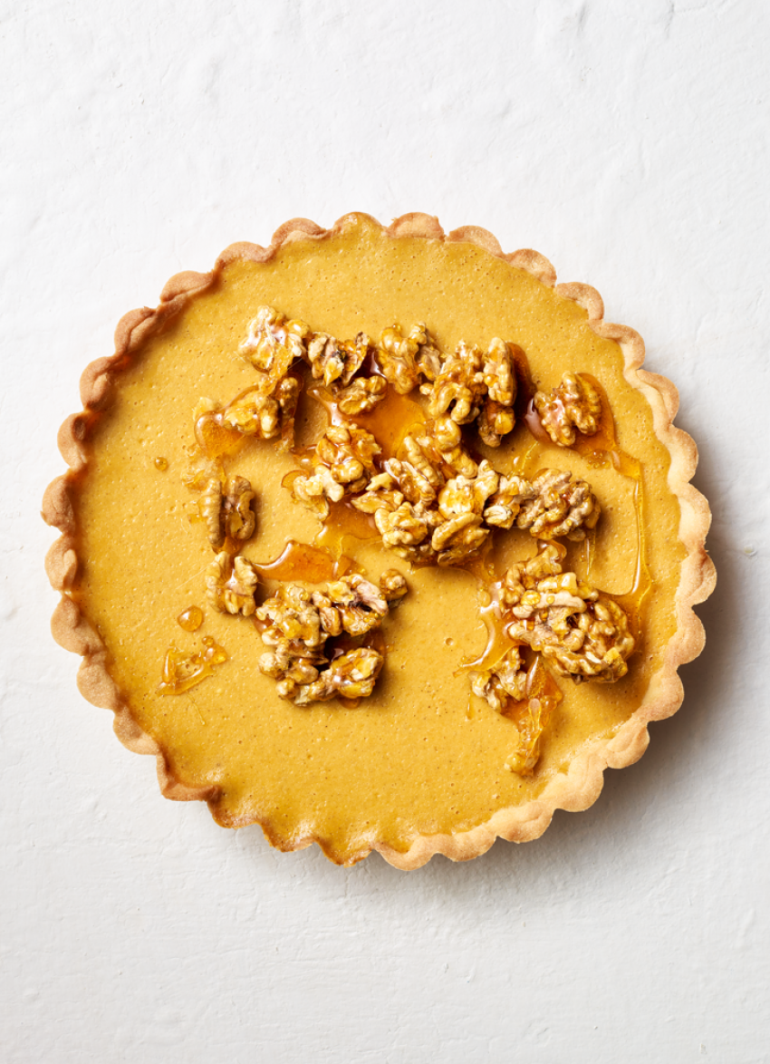 To serve: Serve the tart topped with the walnut praline and softly whipped cream on the side.