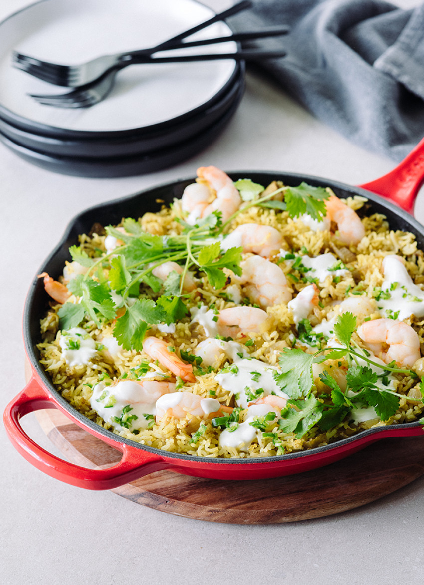 One-pan oven bakes are always a popular dinner option and this lightly spiced version gets topped with fat juicy prawns.