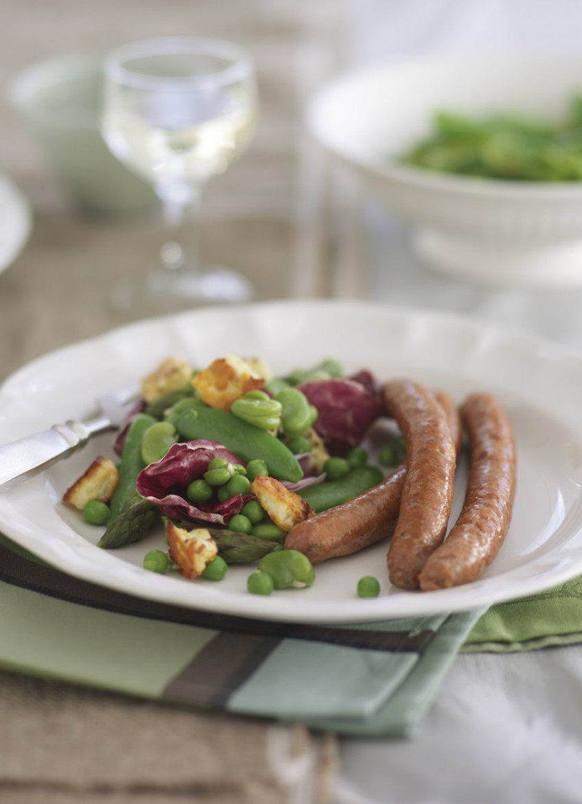 Use fresh or frozen beans and peas for this dish. It is delicious served with spicy sausages or other sausages of choice.