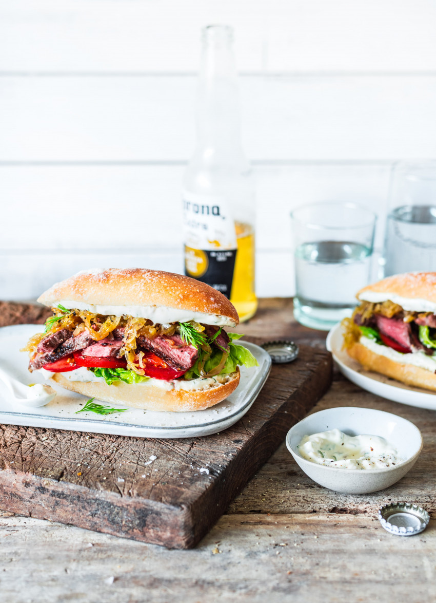 To serve: Fill the rolls with lettuce, tomato, sliced steak, caramelised onions and horseradish cream.