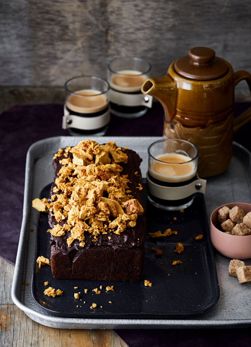 Fragrant with spices, orange zest and rich cocoa, this dense, sticky loaf is topped with indulgent chocolate ganache and shards of honeycomb for a fabulous winter weekend treat.