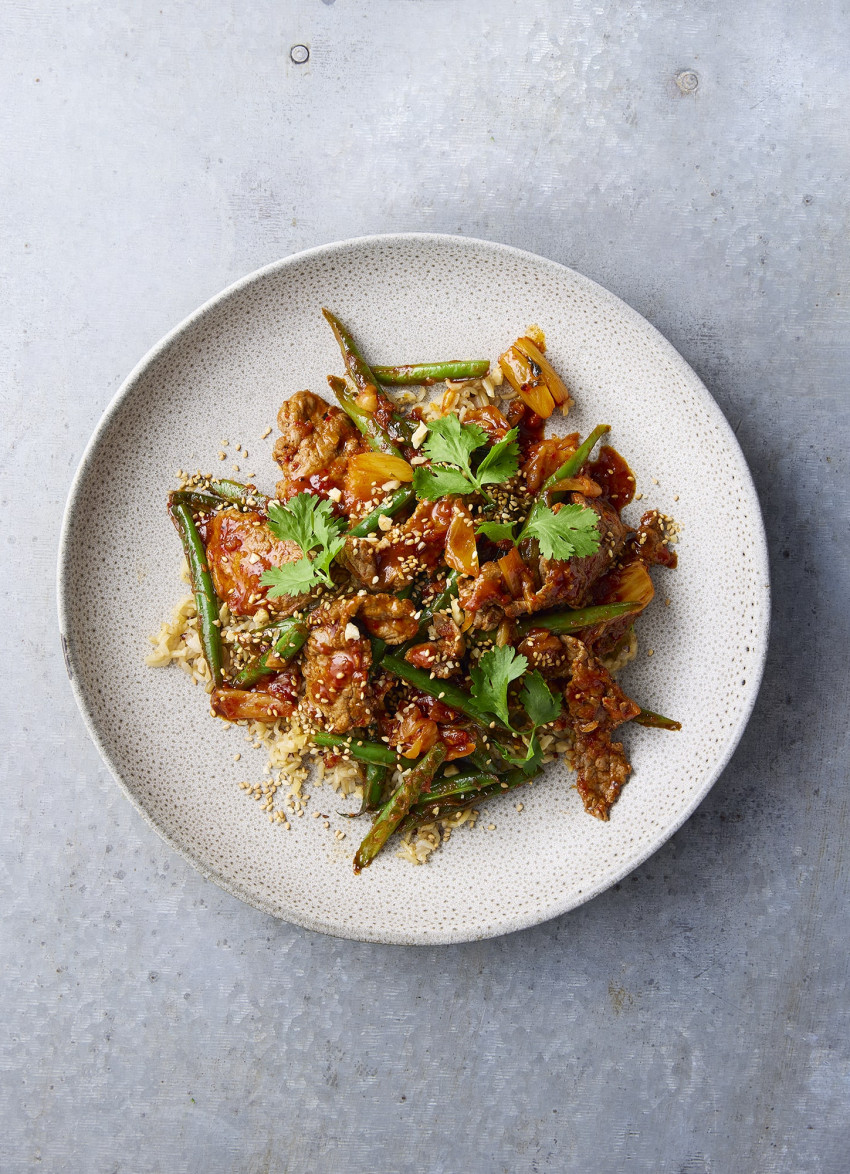 To cook and serve: Season the steak with salt and pepper. Heat a large frying pan with a little oil until searing hot. Add the steak in small batches and cook for 10-15 seconds. Transfer to a plate and cover to keep warm while you cook the remaining steak. Add a little more oil to the pan, add the beans and cook until lightly blistered. Add the kimchi and cook for 2 minutes, tossing together. Tip in the sauce and let it bubble up. Add the beef and resting juices and stir everything together.