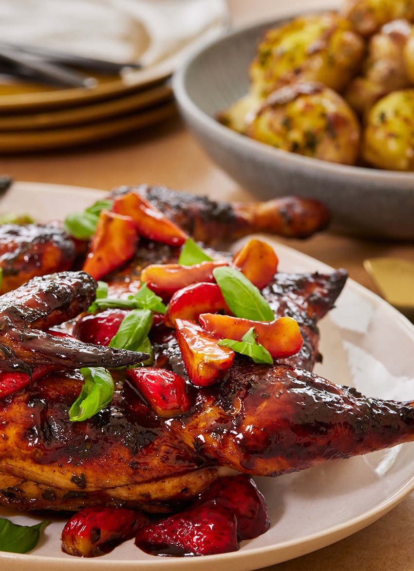 This is a butterflied chicken like no other. Glazed with butter, basil and balsamic and then topped with balsamic marinated strawberries, it’s worth every bite.