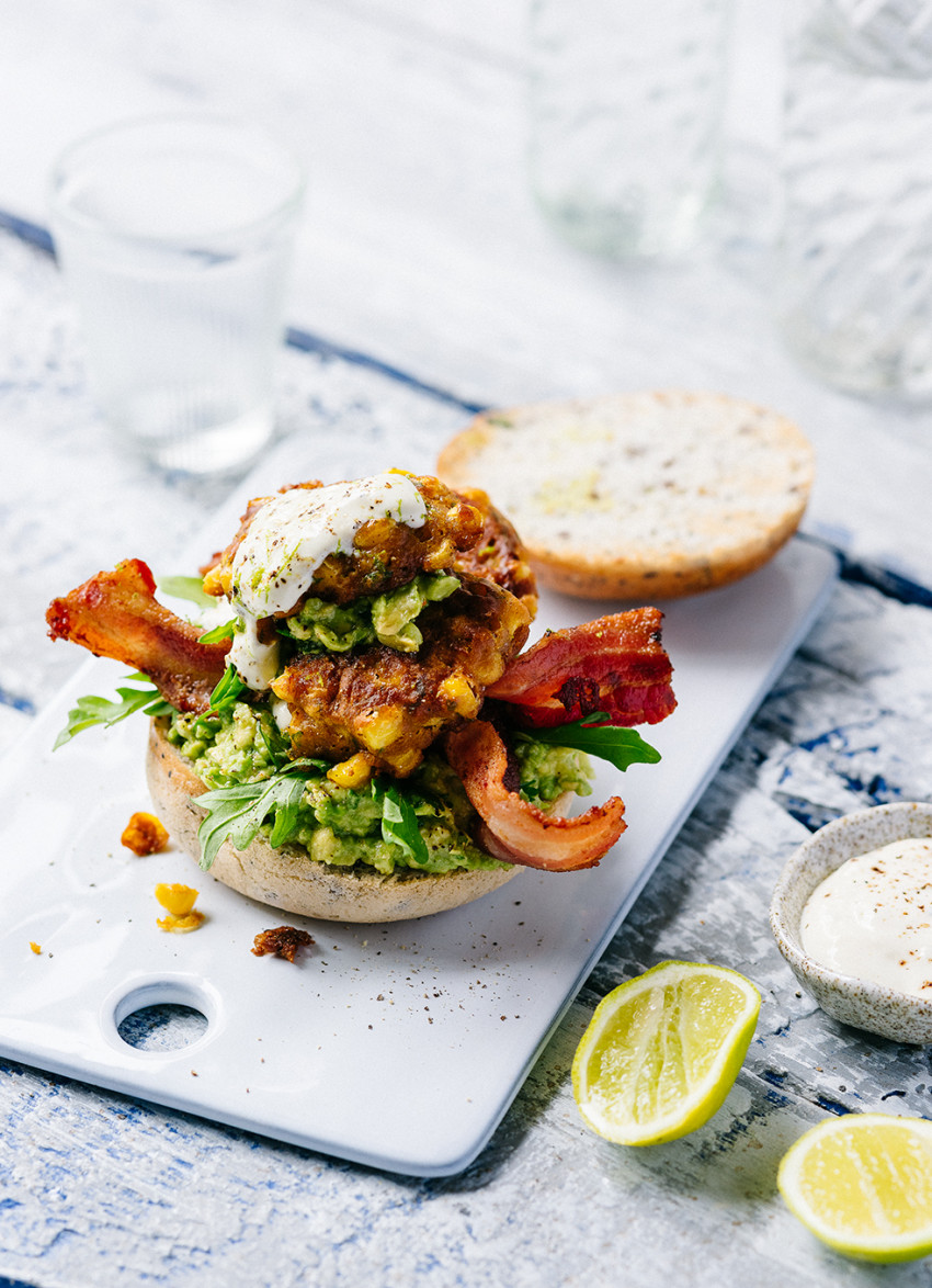 Street Corn Fritter Burgers, Crispy Bacon and Smashed Avocado