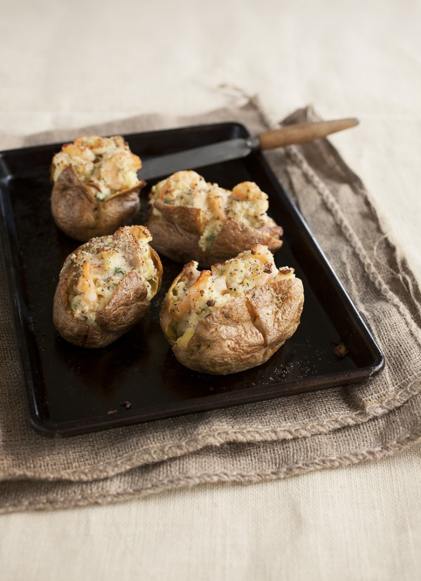 Holding each hot potato in a tea-towel, cut off the top and scoop the flesh into a bowl. Add the mustard and sour cream and beat in enough hot poaching milk to make a creamy mash. Season and fold in the parsley, prawns and the smoked fish.