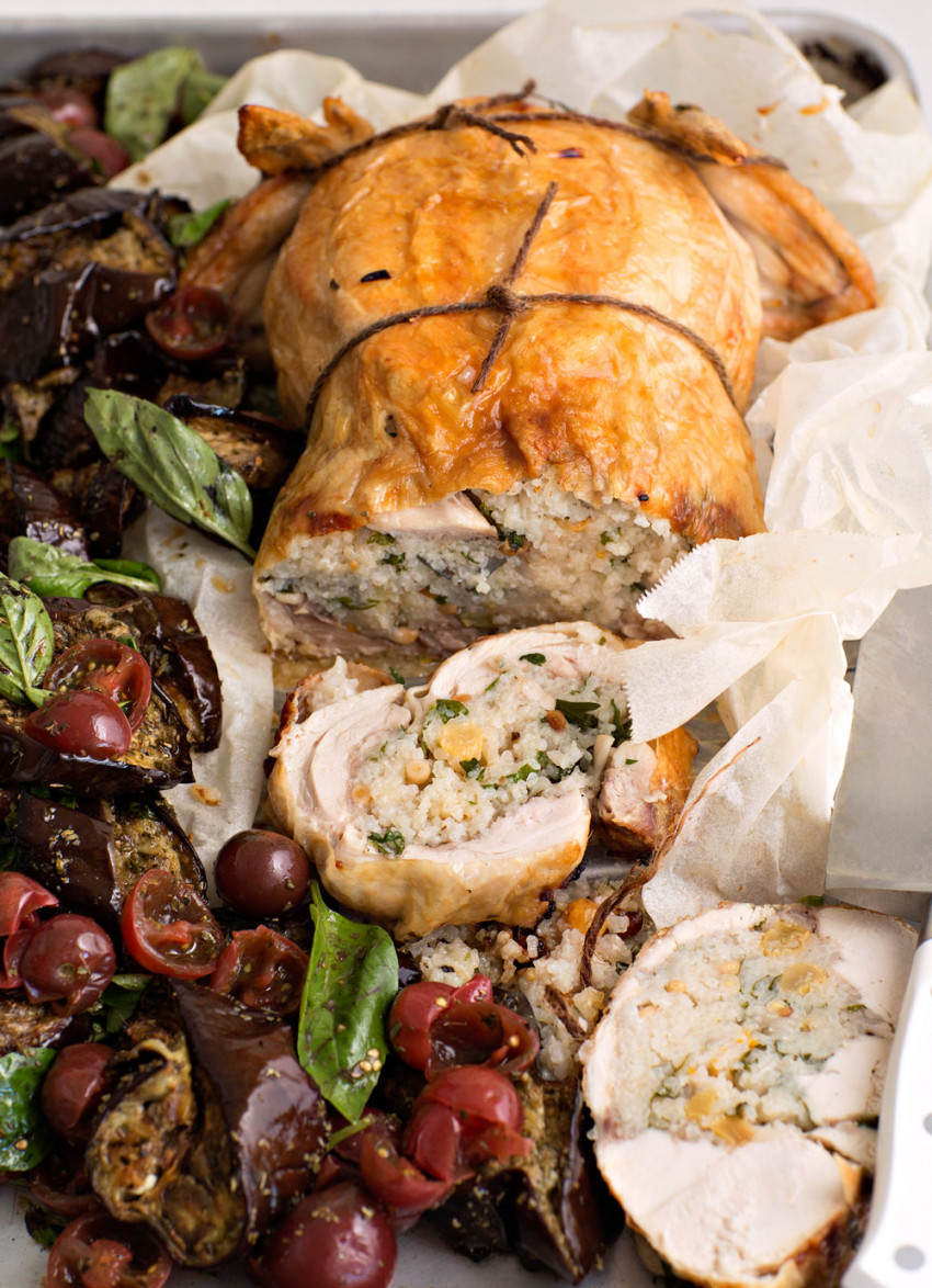 The stuffing used in this chicken is a good option for gluten-intolerant eaters. We like to serve the eggplant salad warm but it is just as delicious served at room temperature.