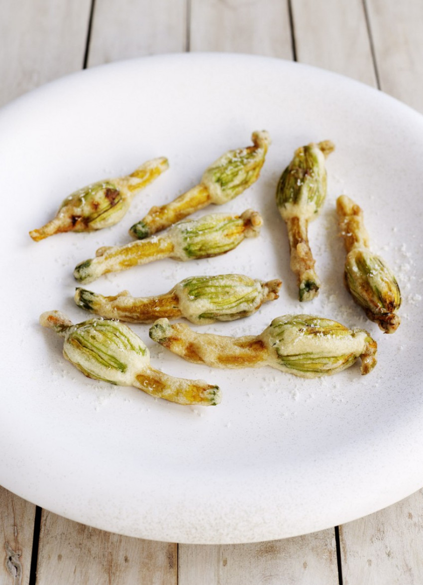 Dip the flowers one at a time in the batter, then using your fingers, gently scrape off enough batter to leave only a very thin coating. Gently place in the oil and cook for about 2 minutes, turning until golden and crisp on all sides. Remove with a slotted spoon and drain on kitchen towels. Sprinkle with extra Parmesan cheese and sea salt. Serve immediately. Serves 4 as an entrée or 6 as a snack