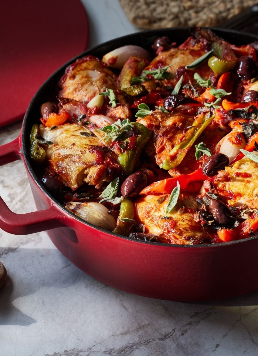 Add the chicken back to the pan & add the passata, stock, olives and herbs. Season.