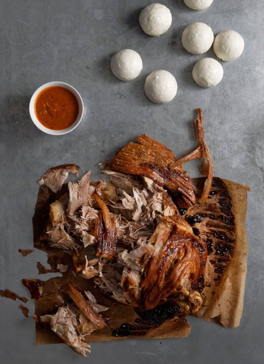 This roast pork dish is epic. Complete with crackling, steamed bread and an arrangement of pickles and vegetables, it's a complete banquet worthy of any celebration.
