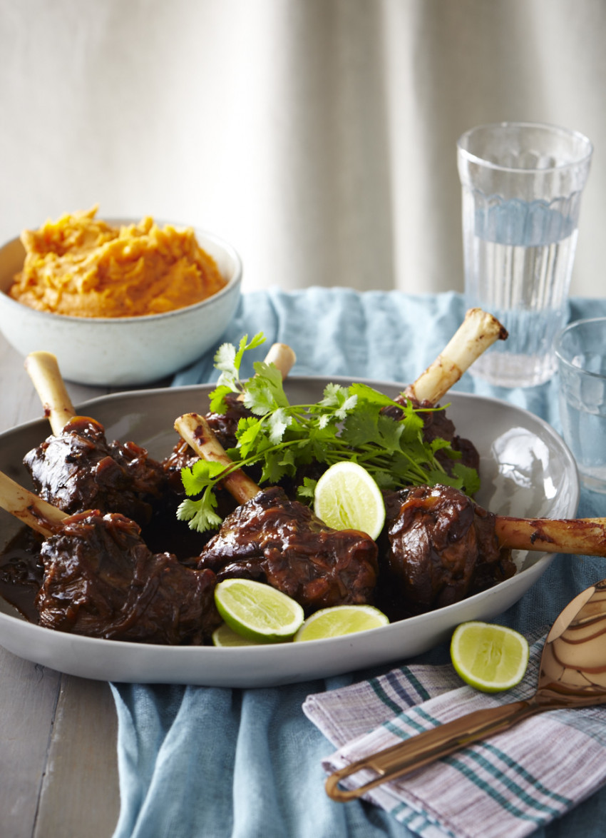 If the sauce is thin, carefully remove the shanks to a bowl and cover to keep warm. Then boil the liquid until reduced and glossy, and pour over the shanks. Serve with lime wedges, coriander and kumara mash if desired.
