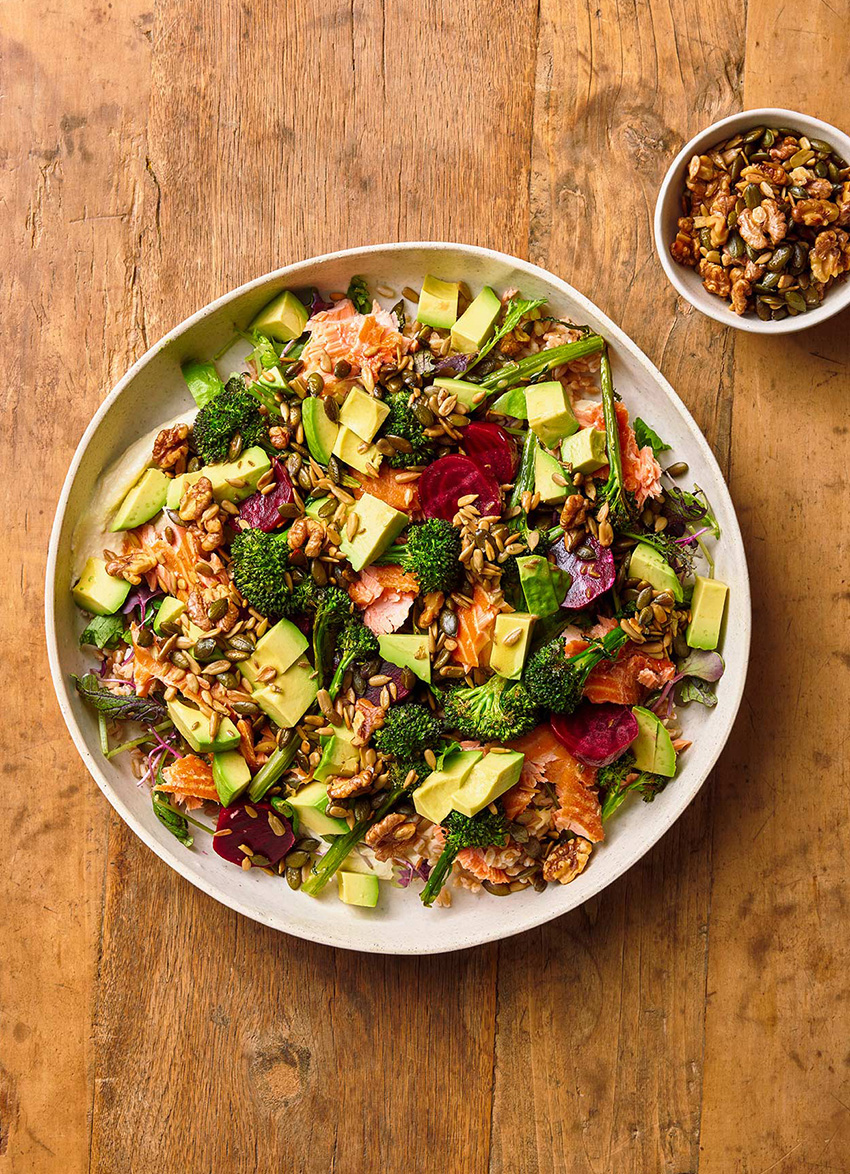 TO ASSEMBLE: Spread the whipped feta on the base of a large serving platter and top with the farro and salad greens. Layer on the beetroot, broccolini, avocado and salmon. Pour over the dressing and top with the nuts and seeds to serve.