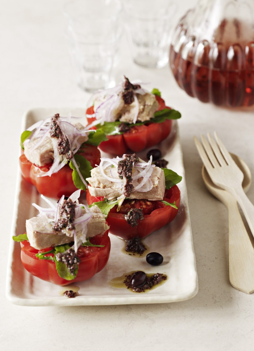 Place a few rocket leaves on each tomato and top with a piece of tuna. Put a small pile of onions on the tuna and spoon over the dressing. Scatter the olives over the salad.