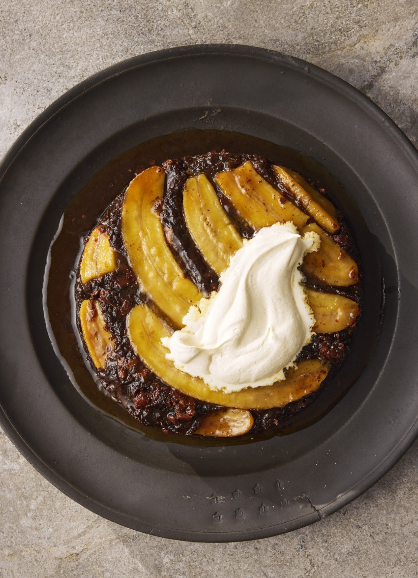 Upside-down Caramelised Banana Pudding with Vanilla Maple Cream and Sea Salt