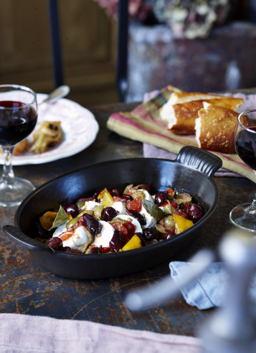 Put the goat’s cheese in a shallow serving dish, overlapping the slices slightly and pour over the hot olive mixture. Serve warm or at room temperature, spreading the cheese and olive mixture on pieces of crusty bread.