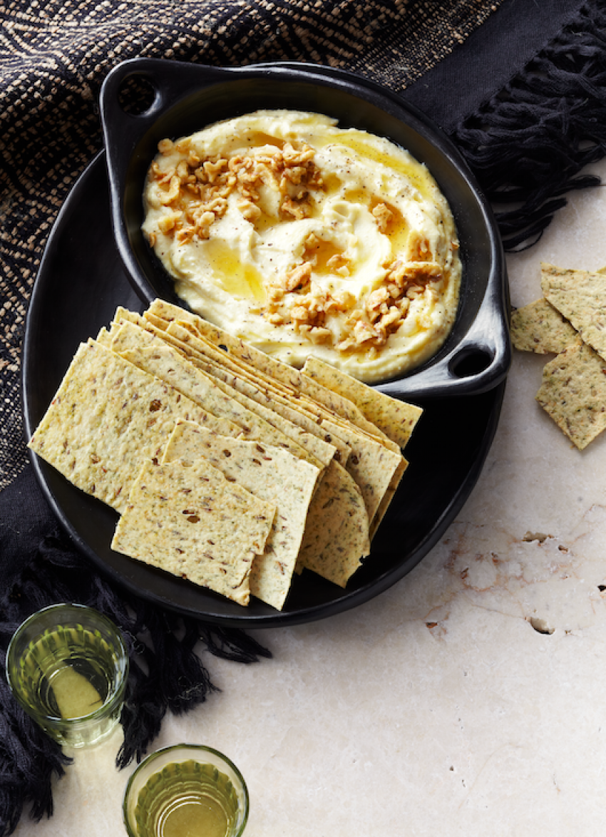 Creamy ricotta and salty feta make a light dip that’s perfect topped with a good drizzle of honey and rich toasted walnuts.