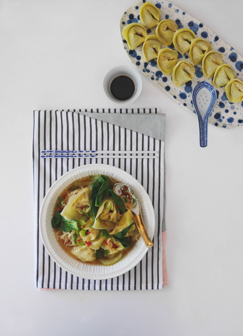 Wonton soup is one of my favourite things and is something I love to order when I eat out. Or a Tom Yum with wontons, yum! I think I actually prefer soft wontons in broth over the fried ones. These are a little fiddly to make, but if you’re in the mood, once you get your rhythm, it’s quite fun. There are all kinds of ways to fold these little parcels; I actually went onto YouTube to look at a few techniques. I love the combination of pork and prawn, and I also added shiitake mushrooms for extra flavour.