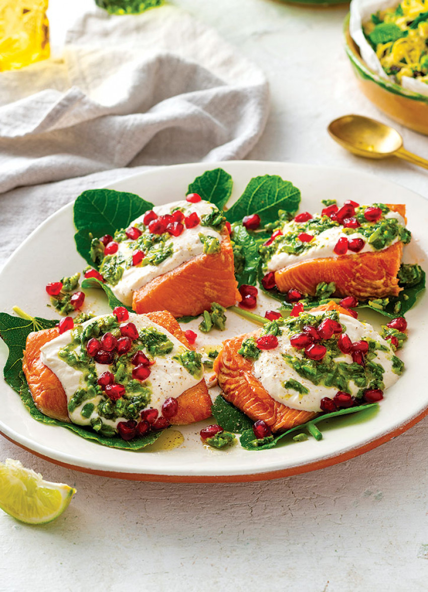 Top with the Tahini Sauce then spoon over the Pistachio Salsa. Scatter over the pomegranate seeds. Serve with lime wedges and a bowl of couscous that’s been tossed with lots of chopped herbs and lemon zest.
