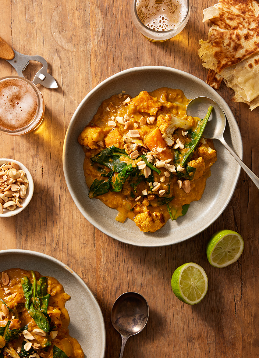 Heat the remaining oil in a large pot or deep frying pan and add the onion. Cook over a medium heat for 8 minutes, until softened but not coloured. Add the garlic, ginger, fish sauce and curry paste and stir to combine. Add the stock, coconut milk and lime leaves, bring to a simmer then add the lentils and cook together for 20 minutes. Add the kūmara, cauliflower and spinach and cook together for a final 5 minutes, then serve immediately with chopped nuts, lime halves for squeezing and flatbreads.