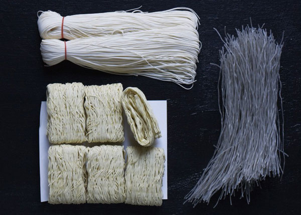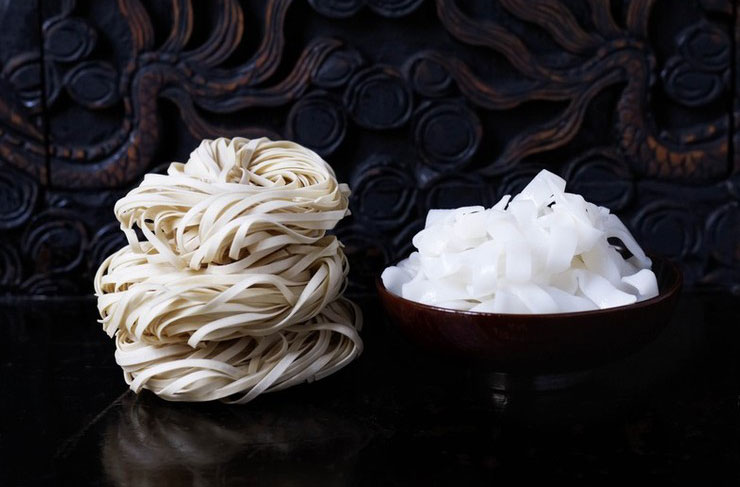 Noodles are made from a variety of rice and wheat flours (with or without egg added), as well as vegetable starches such as mung bean or sweet potato.