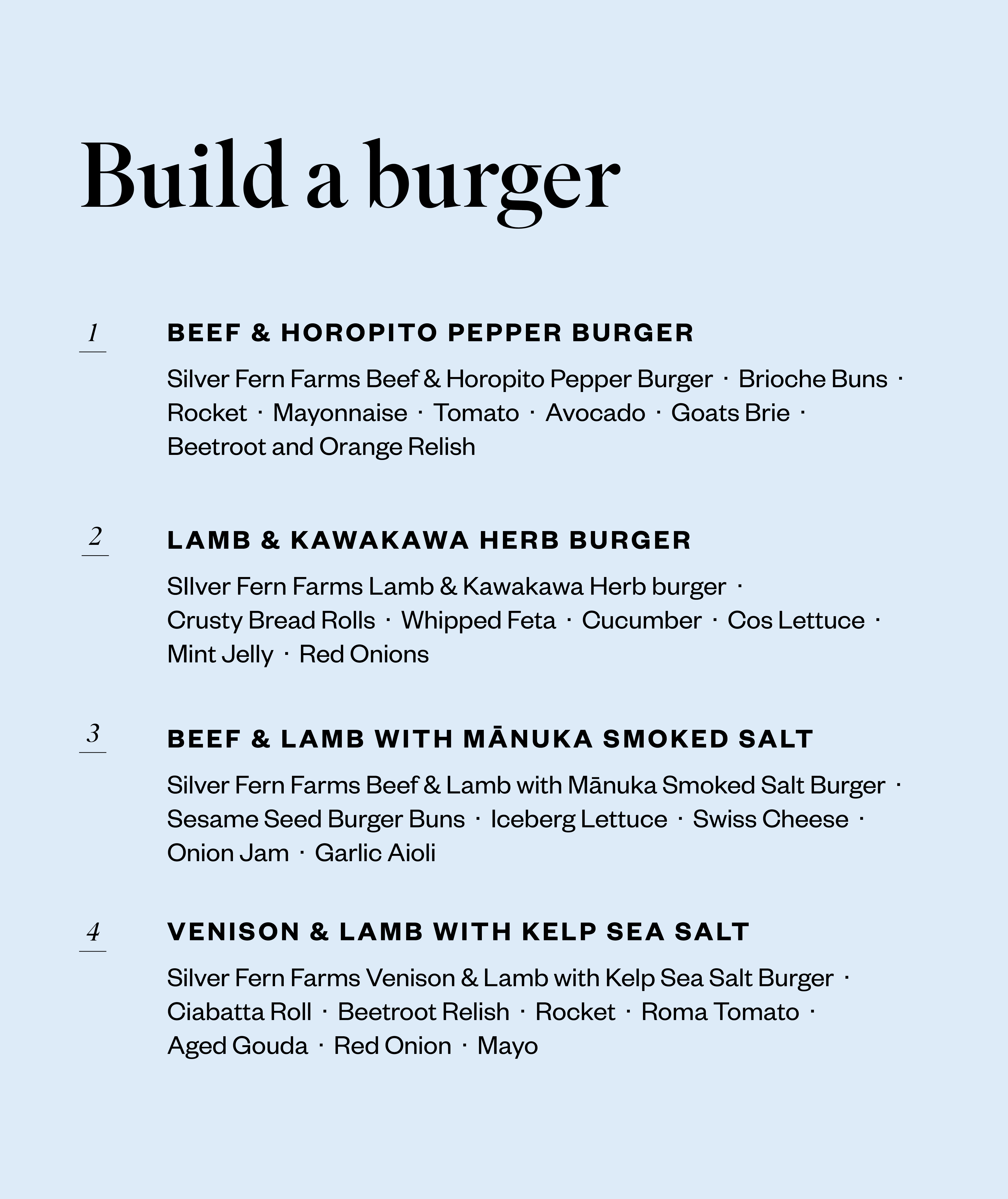 Use our burger builder (below) to match fresh ingredients with one of the Silver Fern Farms Honest Burgers and their unique herbs and spices. Or scroll down for a delicious Beef & Horopito Pepper Burger with Beetroot Relish recipe.